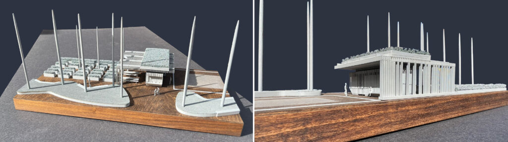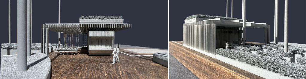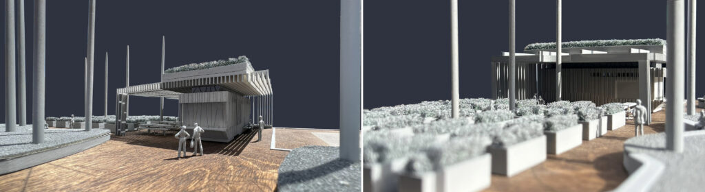 A new planned community serving thousands of new homes in mixed-use development will have as its central feature a large park that borders a regional transit line station. INTERSTICE was asked to design a series of five separate park structures from a shared Community Center, Food kiosk, Community Garden Trellis, Art Focused Orientation Beacon, and Transit Shelter that would be distributed along the 32-acre linear Park Promenade. The Park is to be a new forested amenity for the many medium-density buildings planned over the next ten years serving as the heart of the community-shared public commons.