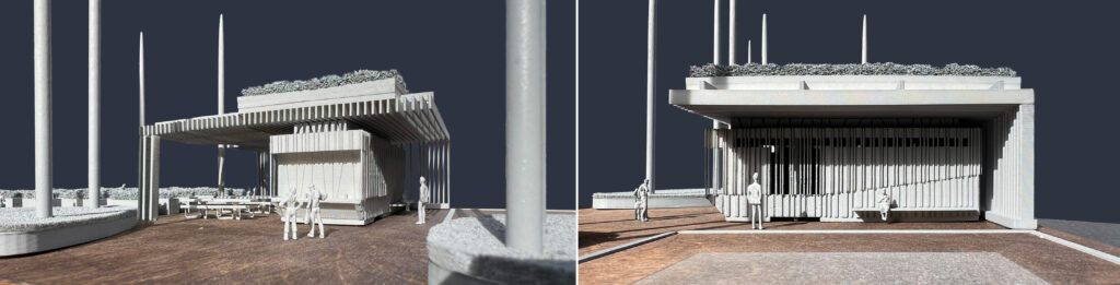 The porosity and shape of the pavilions allow for them to be read as both inhabitable “trunks” within the larger forest, and as porous social filters allowing space to flow between and around them; merging inside and outside spaces through dynamic walls and deep overhangs – while at night becoming lanterns that sparkle and glow within the parks seasonal vocabulary of change.