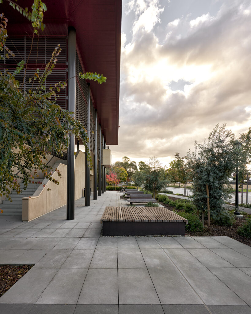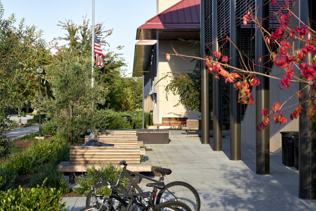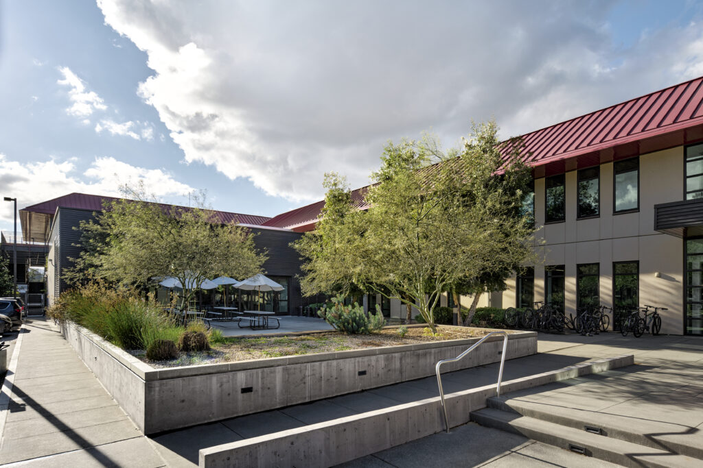 The plazas serve as the public entry for students and the general public, as well as integrating bicycle parking among native Coast Live Oak grove plantings that run the length of the frontage along Bonair Siding Road. The sidewalk edge is defined by a low seat wall acting as a protective vehicular barrier, and a sculptural mounding topography of native California wild lilac and coyote bush plantings between the sidewalk and facade.